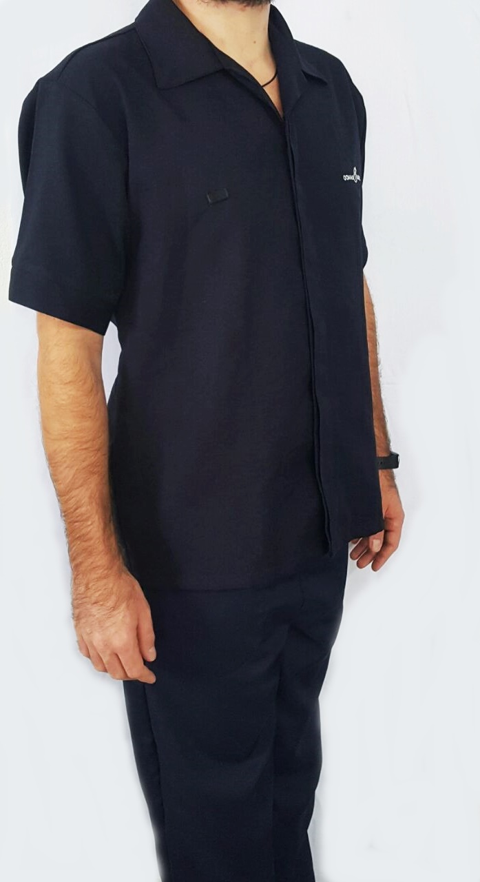 Camisa OXFORD azul marinho com 5 botões cor azul na parte do corpo, 2 botões cor azul no quadrado do peito